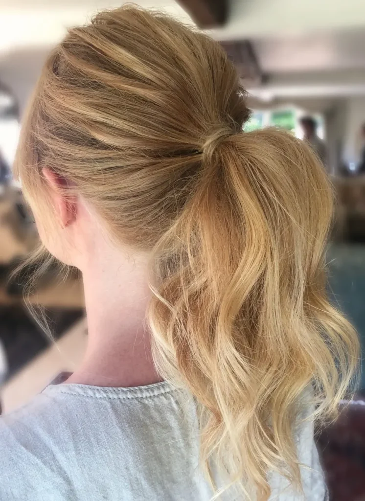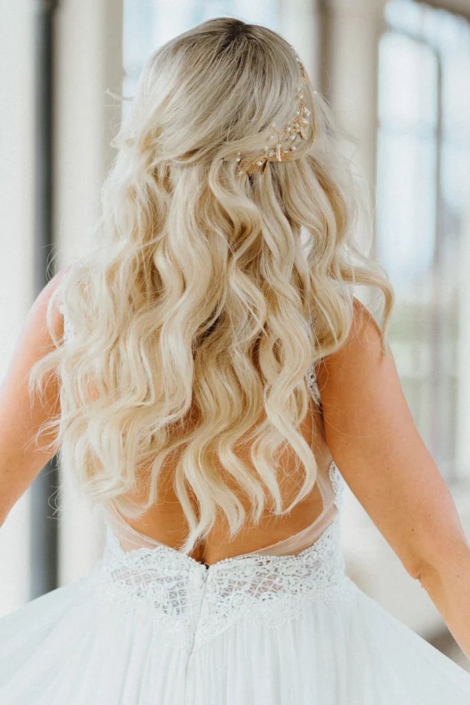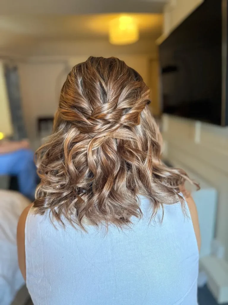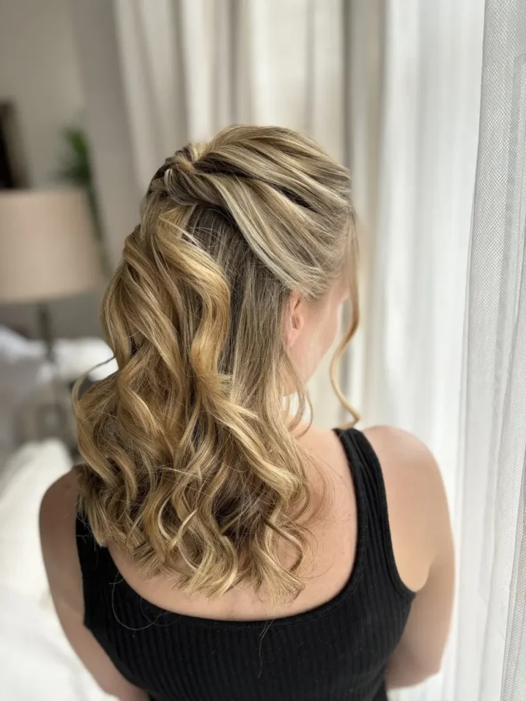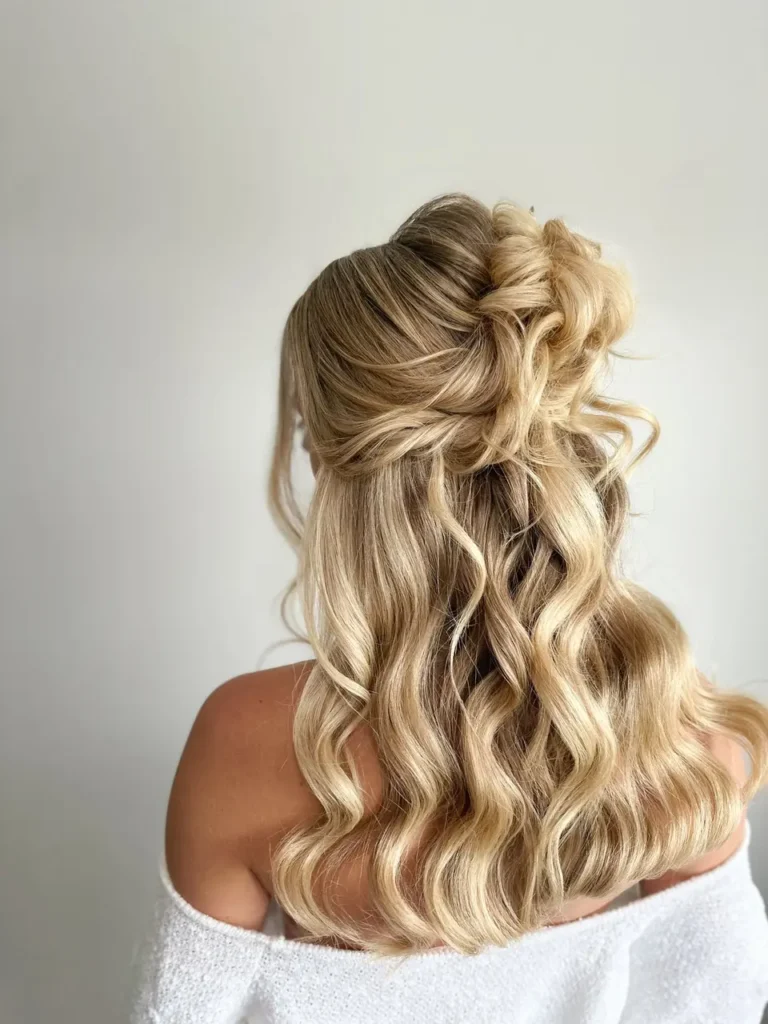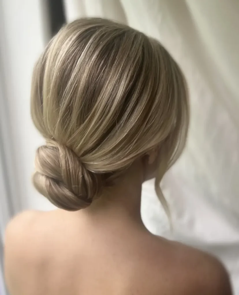 Effortless elegance defines this chic blonde look, making it a standout choice for bridesmaid hairstyles. Soft waves cascade from a central knot, creating natural movement and a relaxed yet polished vibe. Gentle volume at the crown provides a subtle lift that enhances the overall silhouette without appearing overly structured.