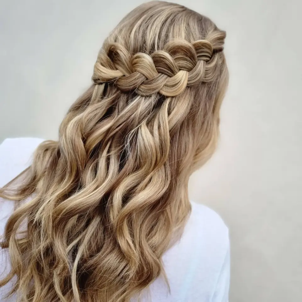 Luminous blonde highlights ripple through this relaxed design, showcasing one of the most popular bridesmaid hairstyles. A thick horizontal plait encircles the crown to create a natural headband effect that secures the top sections. Cascading waves flow freely from beneath the braid, adding volume and a youthful energy to the overall silhouette.