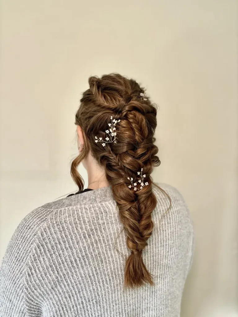 Resplendent brunette locks weave together to form a thick, textured plait that serves as a focal point for bridesmaid hairstyles. Delicate white floral pins nestle into the twists to provide a touch of organic charm and subtle sparkle. Wispy tendrils frame the face to soften the look while maintaining a structured and elegant finish.