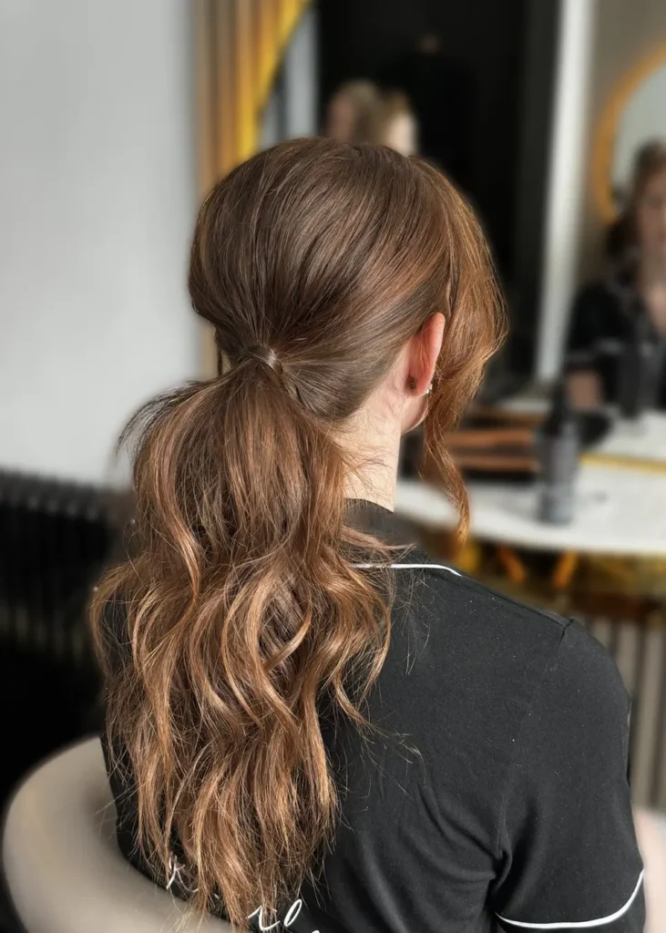 Glistening chestnut strands gather at the nape to form a sleek, understated look for bridesmaid hairstyles. A smooth section of hair wraps around the elastic to hide any hardware and maintain a high-end finish. Subtle volume at the crown adds just enough lift to create a flattering shape that highlights the natural shine of the hair.
