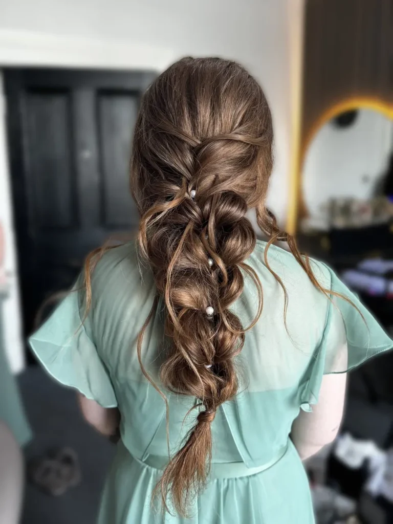 Lustrous chestnut locks are intricately woven into a voluminous, oversized plait that serves as a sophisticated choice for bridesmaid hairstyles. Tiny white pearls are scattered throughout the twists to add a touch of timeless grace and subtle light-catching detail. Long, delicate tendrils escape the main structure to soften the look around the shoulders and neck.