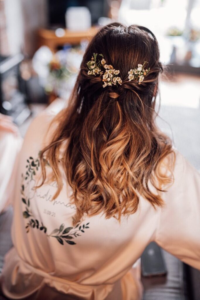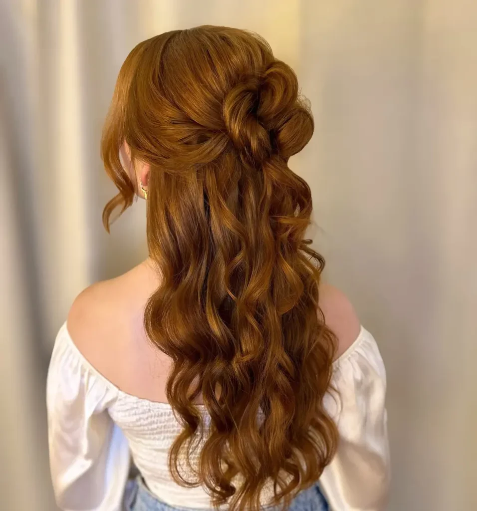 Luminous copper tones radiate through these cascading curls, offering a breathtaking choice for Top 22 Bridesmaid Hairstyles Ideas. Tiny white blossoms nestle into the twisted crown to create a whimsical and romantic vibe. This effortless arrangement provides a balanced look that keeps hair away from the face while showcasing length.