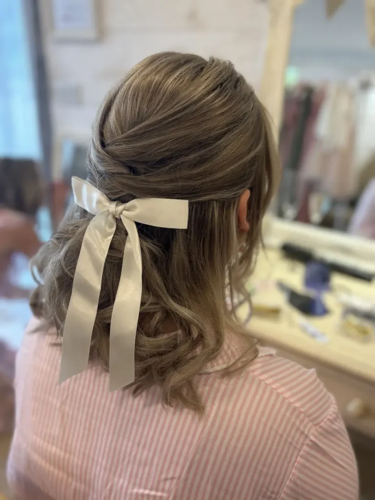 Ethereal satin ribbons transform simple locks into one of the most charming bridesmaid hairstyles. This design features hair pulled back from the sides and secured with a classic cream bow for a timeless finish. Soft waves peak out from beneath the silk accessory to create a look that feels both youthful and sophisticated.