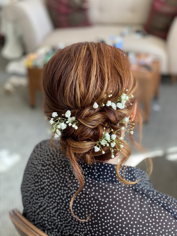 Copper highlights catch the light beautifully within the intricate twists of the braided knot. Delicate sprigs of white baby’s breath are tucked strategically throughout the hair to provide a soft, floral contrast against the warm auburn tones.