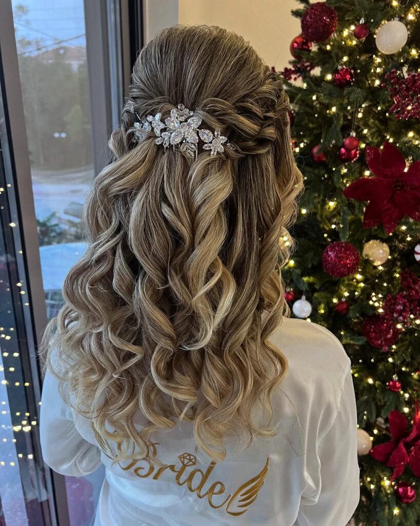 Illuminating the festive scene, this captivating half-up hairstyle showcases lengthy blonde hair styled in soft, loose waves that flow down the back. Two neat twists of hair are brought back from the sides and secured at the center with a breathtaking, large crystal brooch.