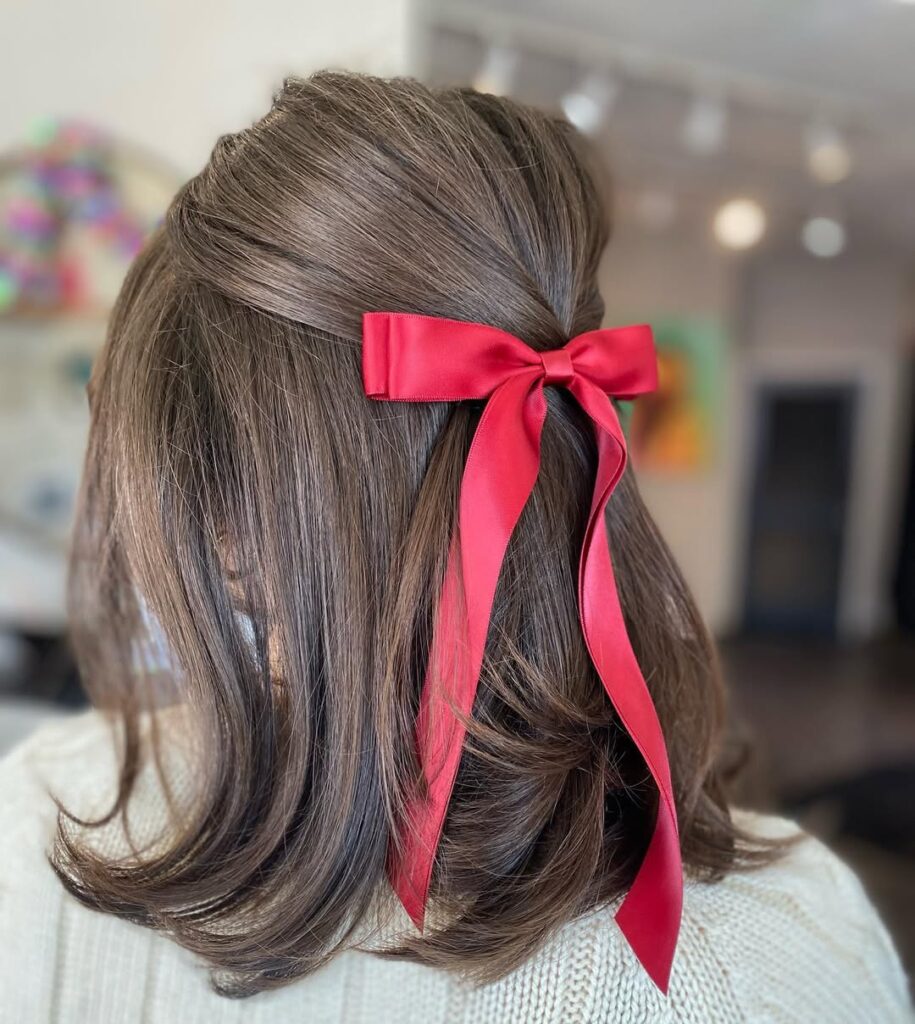 Glimmering with timeless elegance, this half-up hairstyle is a delightful choice for any festive gathering. The rich, satin red ribbon acts as a stunning focal point, securing the top section of the hair and creating a beautiful contrast against the wearer’s deep brown locks.