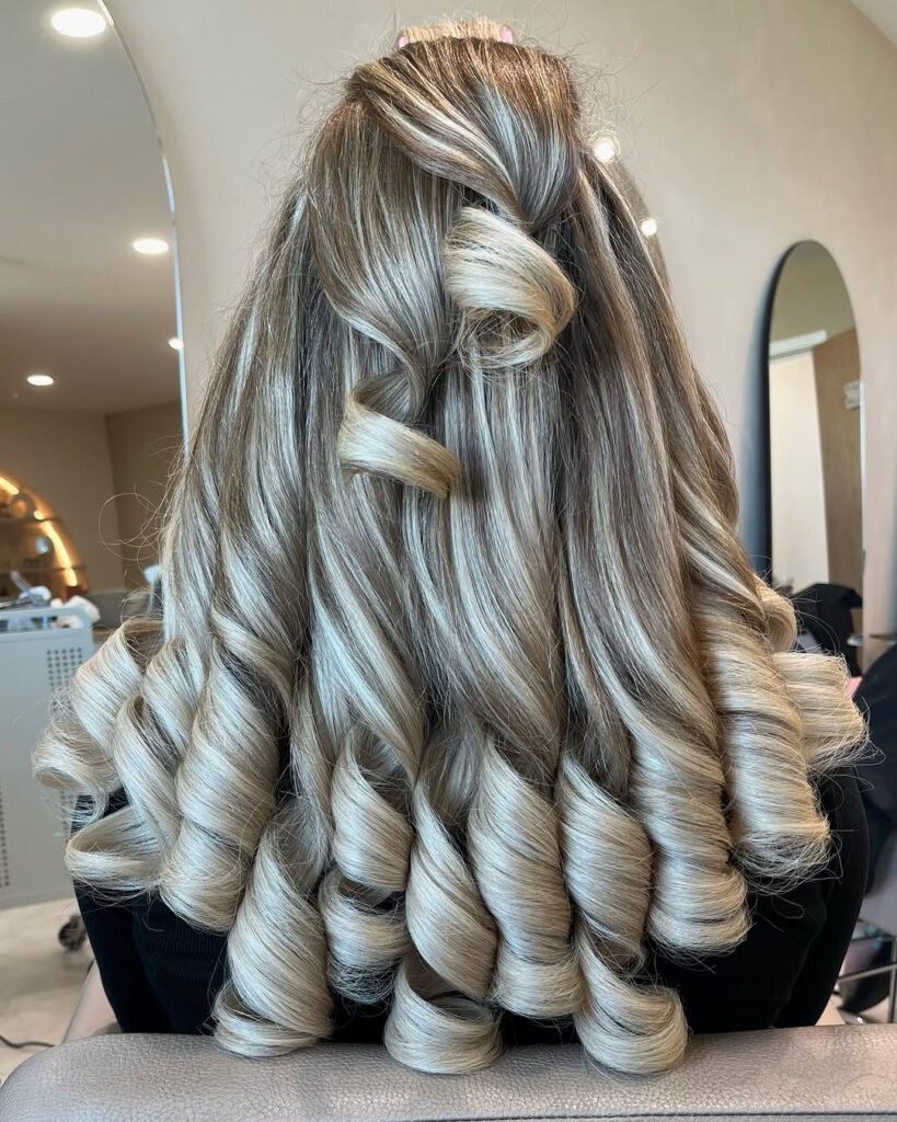 Skillfully highlighted by the warm Christmas lights in the background, the various blonde tones and lowlights are emphasized by the deeply defined curls. The floral crystal clip, composed of clear rhinestones, catches the illumination beautifully, adding a touch of festive, icy sparkle to the overall design.