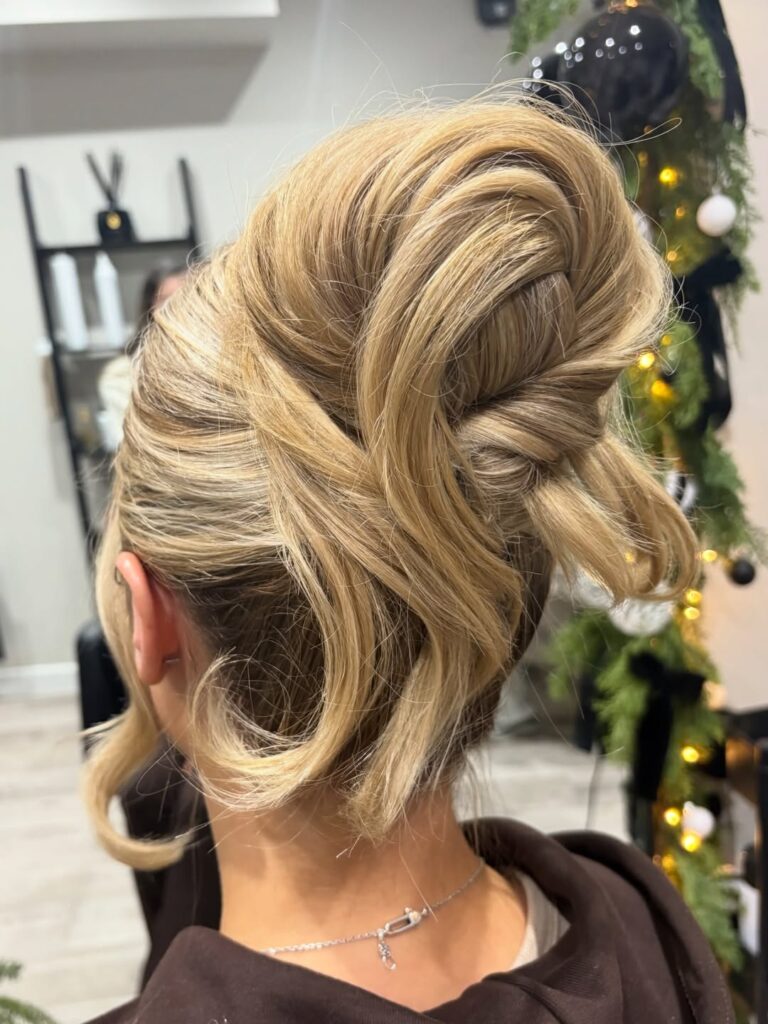 Skillfully executed, the twisted sections add dimension and structure to the crown area, subtly lifting the hair for a voluminous effect without being overtly formal. The hair color, featuring blended blonde highlights and lowlights, gains spectacular depth and shine from the surrounding holiday lights.