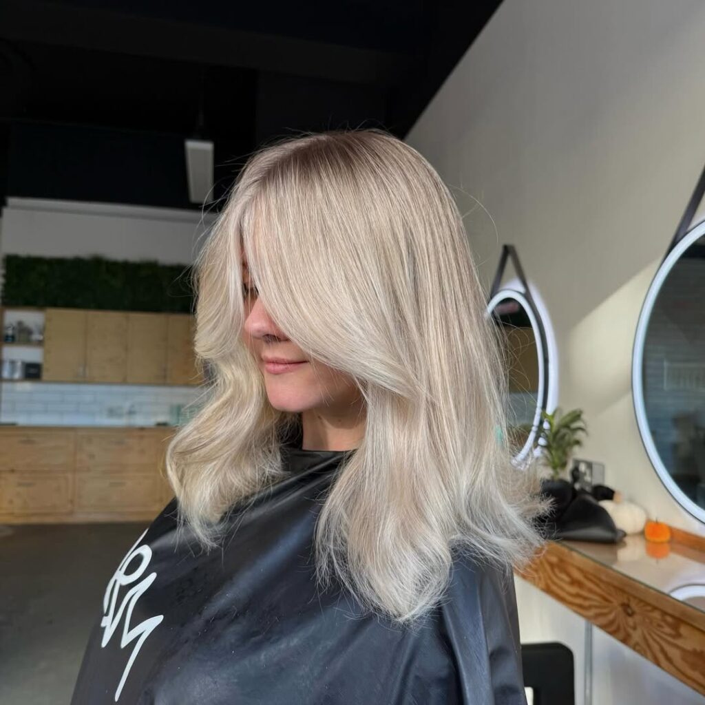 Skillfully cut and colored, the seamless blend of the root color into the cool blonde ensures a sophisticated, low-maintenance contrast that adds depth. The subtle waves provide texture and body, giving the hair a voluminous bounce that feels modern and effortless.