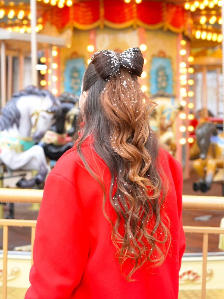 Visibly unique and celebratory, the hair bow stands out dramatically against the fiery red coat worn by the individual and the bright, blurred carousel background. The cascading white pearls add a subtle shimmer that mimics falling snow, enhancing the whimsical, wintery feel of the style.