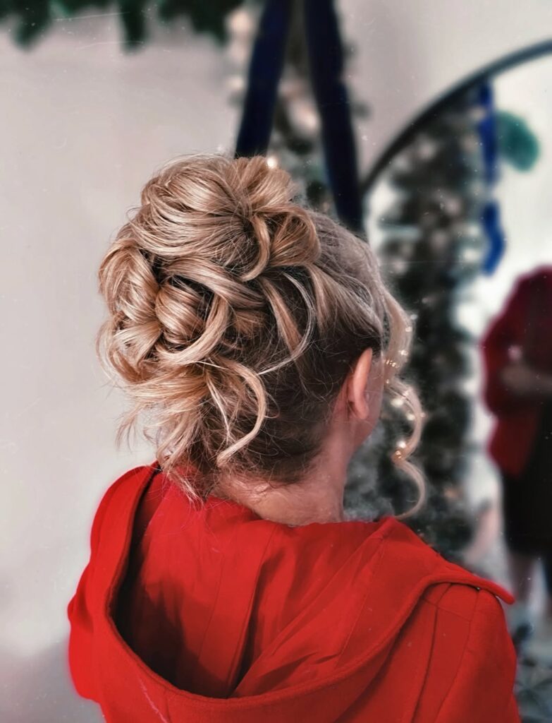 Undeniably stylish and well-suited for a formal occasion, this high bun variation offers a modern take on classic updos by prioritizing texture and softness. The overall shape is flattering and secure, guaranteeing the style holds up through the duration of a festive party.