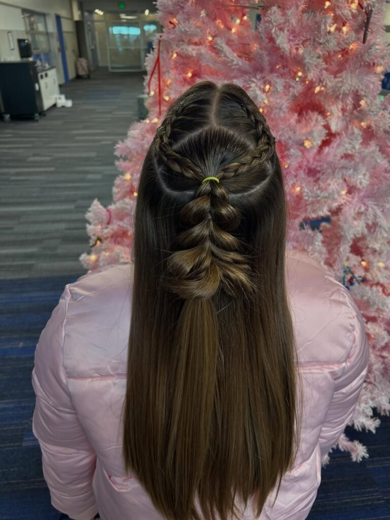 Glimmering with youthful, intricate detail, this fun half-up style features a series of braids creating a lovely, inverted triangle or ‘Christmas tree’ design. The dark brown hair is divided into clean sections, with two thin Dutch braids tracing the crown, connecting to a central twist and then flowing into a chunky, textured fishtail braid.