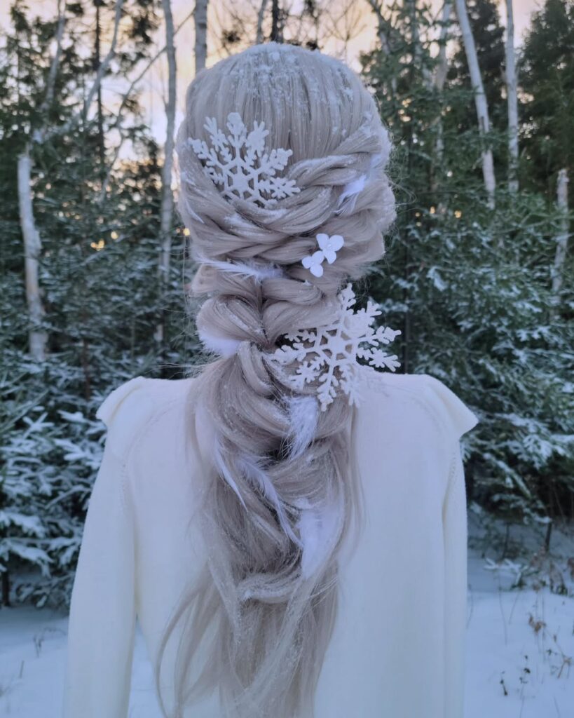 Subtly enhanced by the icy palette, the hair color perfectly complements the snowy, wooded outdoor setting, creating a cohesive, ethereal vision. The chunky braid keeps the hair secure while the feather and snowflake additions introduce a whimsical, playful texture.