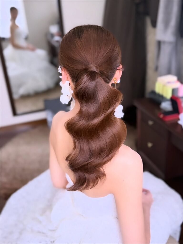 Exuding classic glamour, this stunning hairstyle features rich brown hair pulled back into a sleek, low ponytail. The real artistry lies in the length of the ponytail, which is styled into deep, continuous, glossy Hollywood waves, giving it a sophisticated, sculptural finish.