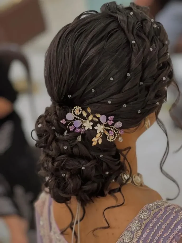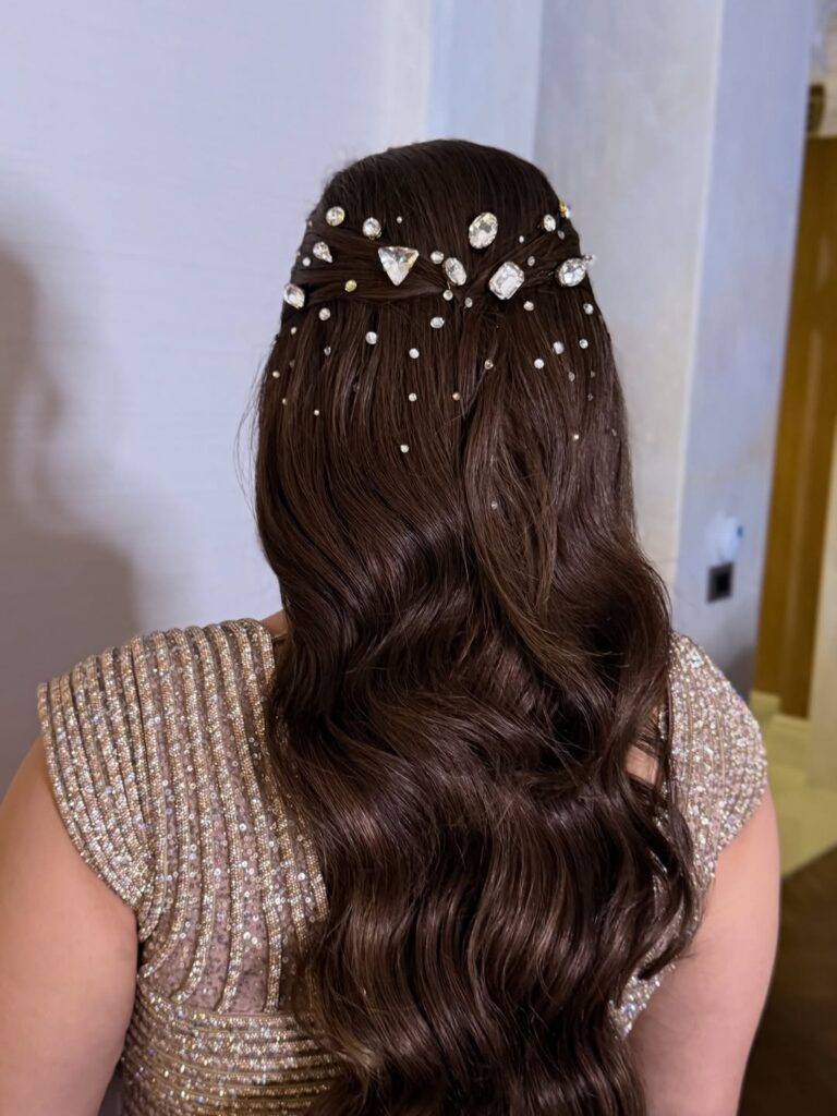 Glimmering with spectacular luxury, this half-down style features rich, dark brown hair styled in soft, defined waves that flow beautifully over the shoulders. The look is dramatically enhanced by numerous small, scattered rhinestone pins and larger geometric jewels placed across the crown, creating a “sprinkle” effect.