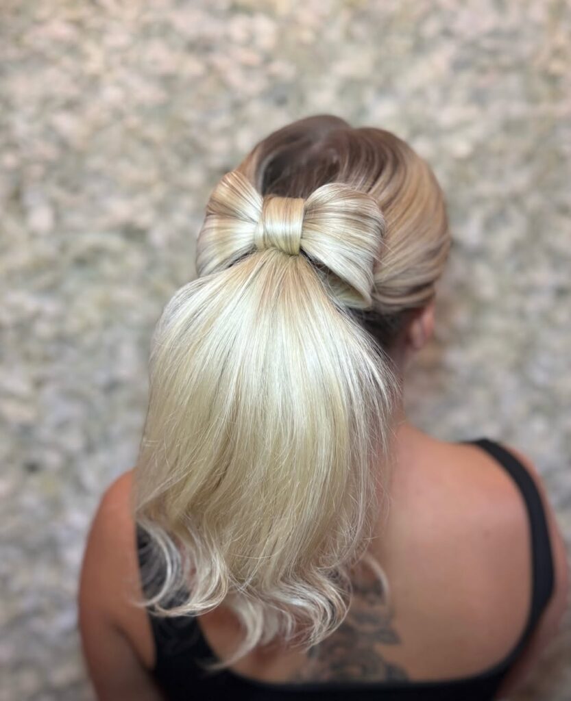 Gracing the head with a playful elegance, this high ponytail features a striking bow cleverly fashioned entirely from the wearer’s blonde hair. The ponytail itself is smooth and voluminous, ending in a gentle curl that provides beautiful shape and movement.