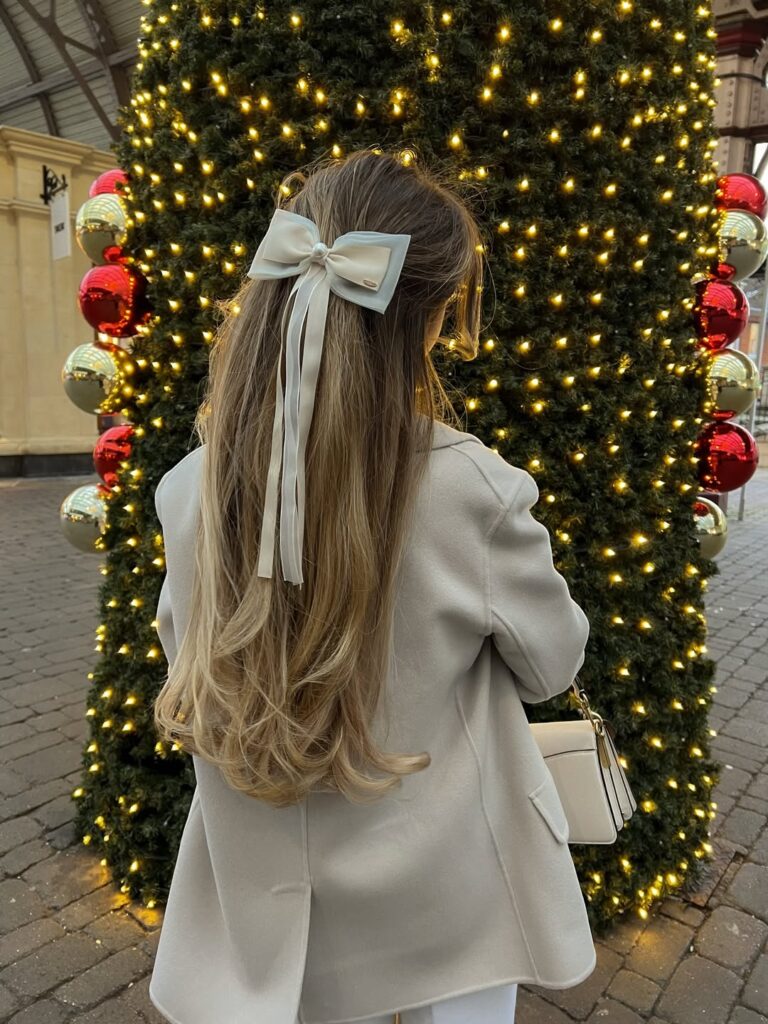 Subtly yet powerfully festive, the lengthy ribbons of the bow dangle gracefully down the back, echoing the length of the wearer’s flowing hair. The creamy, neutral outerwear complements the light colors of the bow, creating an overall look of serene elegance.
