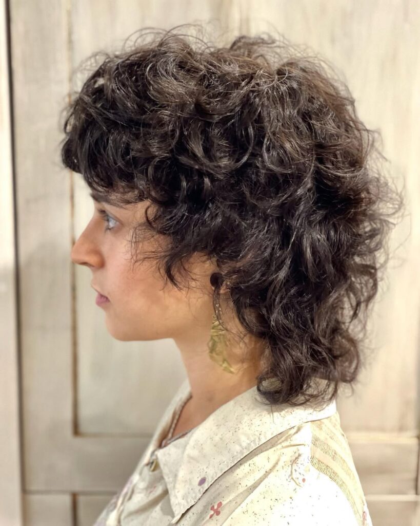 Unquestionably, this cut maintains a distinctly shaggy aesthetic, which gives the traditional mullet structure a graceful, wearable update. The layering technique ensures the heavy, rich curls don’t weigh down the overall shape, providing movement and bounce throughout the length.