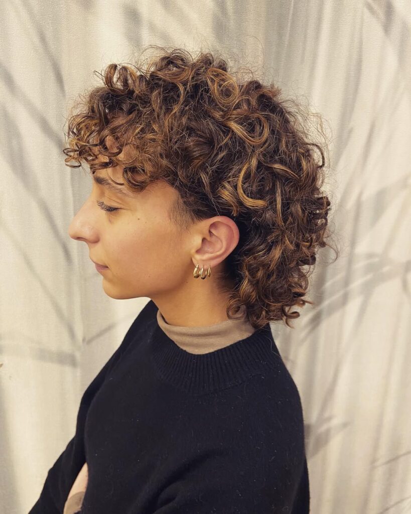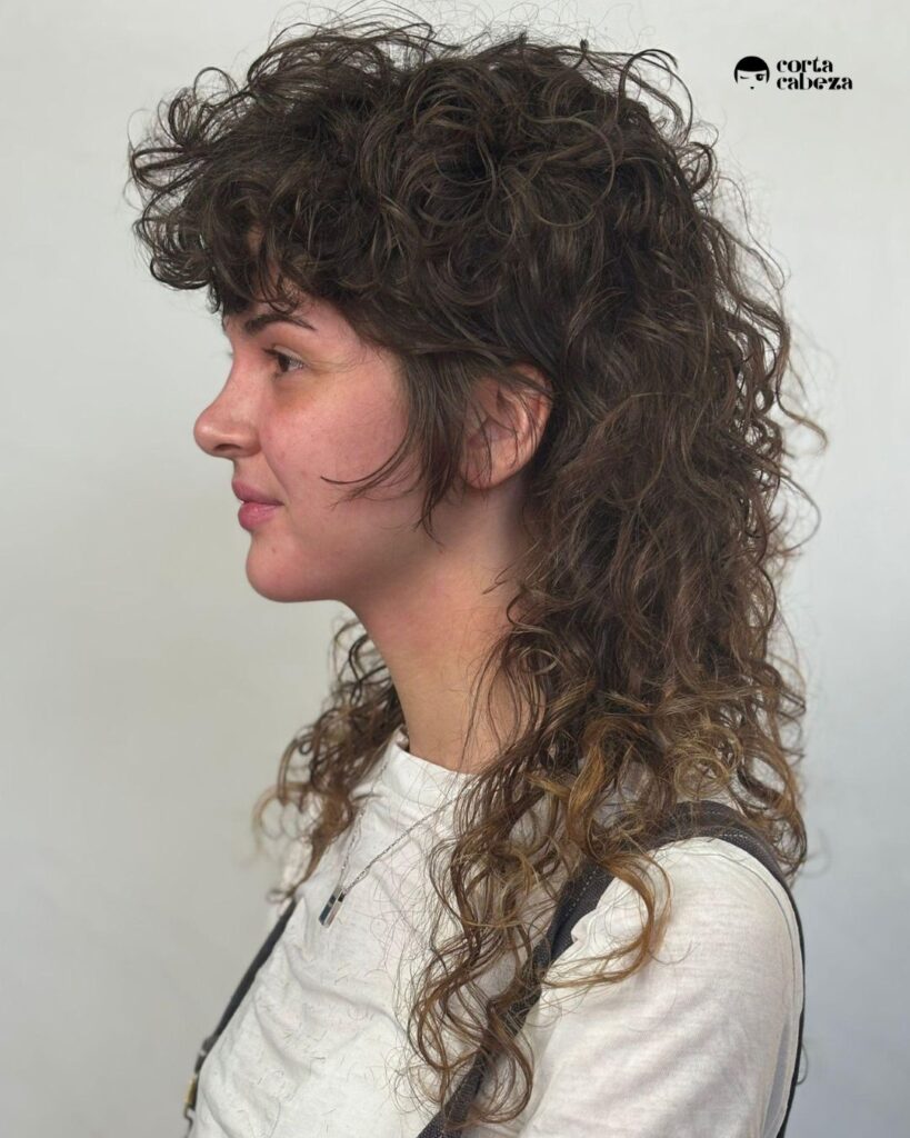 Strikingly modern, this curly mullet offers a fresh, textured take on a classic retro style, making it a fantastic look for 2026. Warm honey and buttery blonde highlights are expertly woven through the natural brown base, adding significant depth and beautifully defining each spiral.