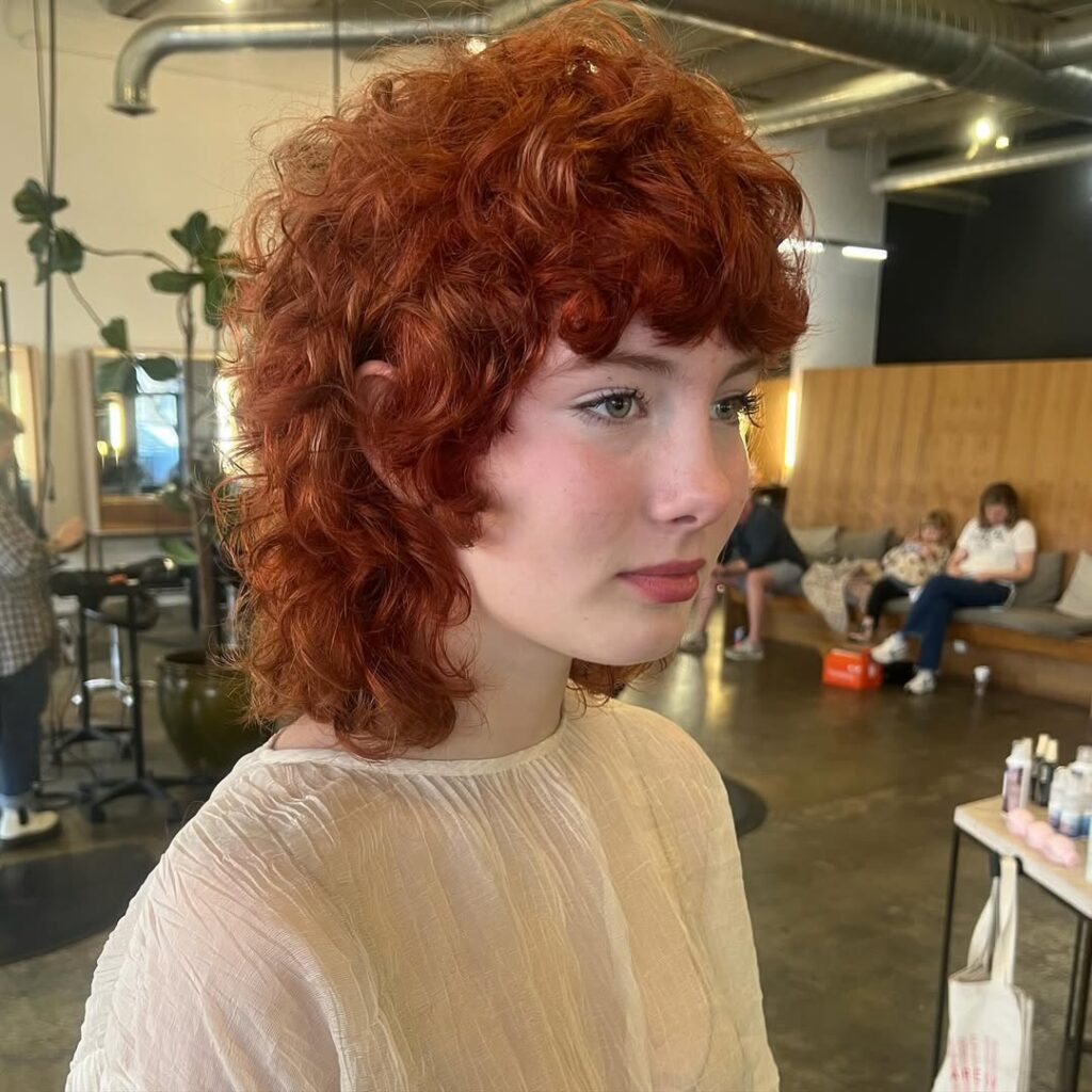 Admirably, this short-to-medium-length style is a fantastic example of a trendy curly mullet designed to celebrate high volume and dramatic color saturation. Maintaining the brilliance of the copper hue requires using specialized color-safe products and minimizing exposure to heat and harsh sunlight.