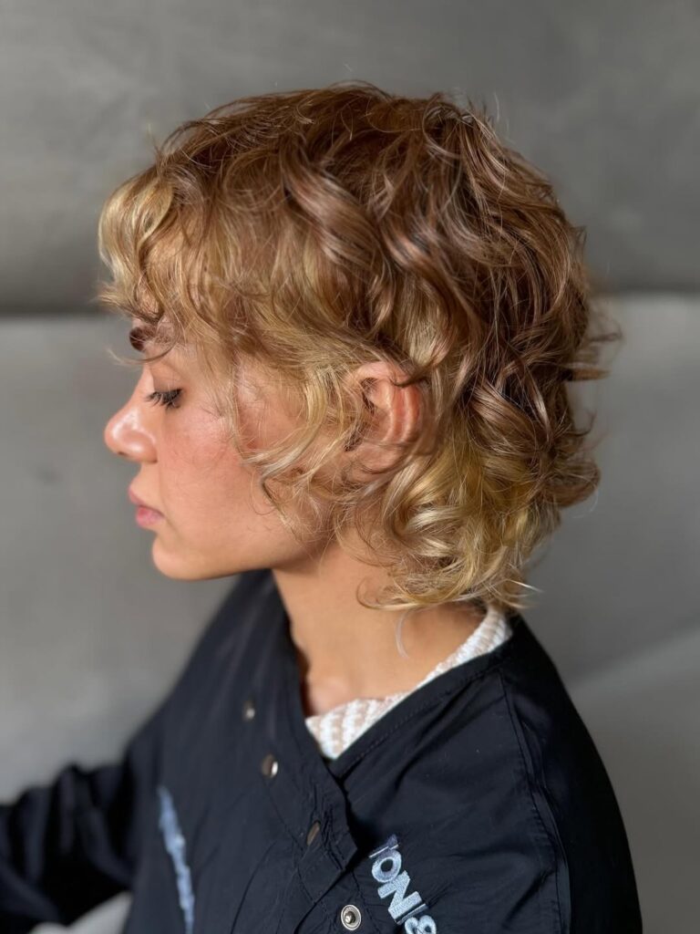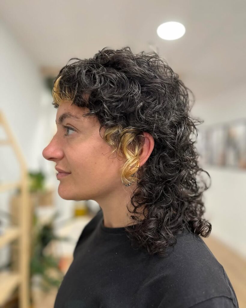 Furthermore, this look is an excellent example of a trendy curly mullet that uses strategic color blocking to enhance the cut’s unique shape and attitude. Maintaining the brilliance of both the dark curls and the lightened streaks requires diligent care with color-safe and moisturizing products to keep the texture defined.