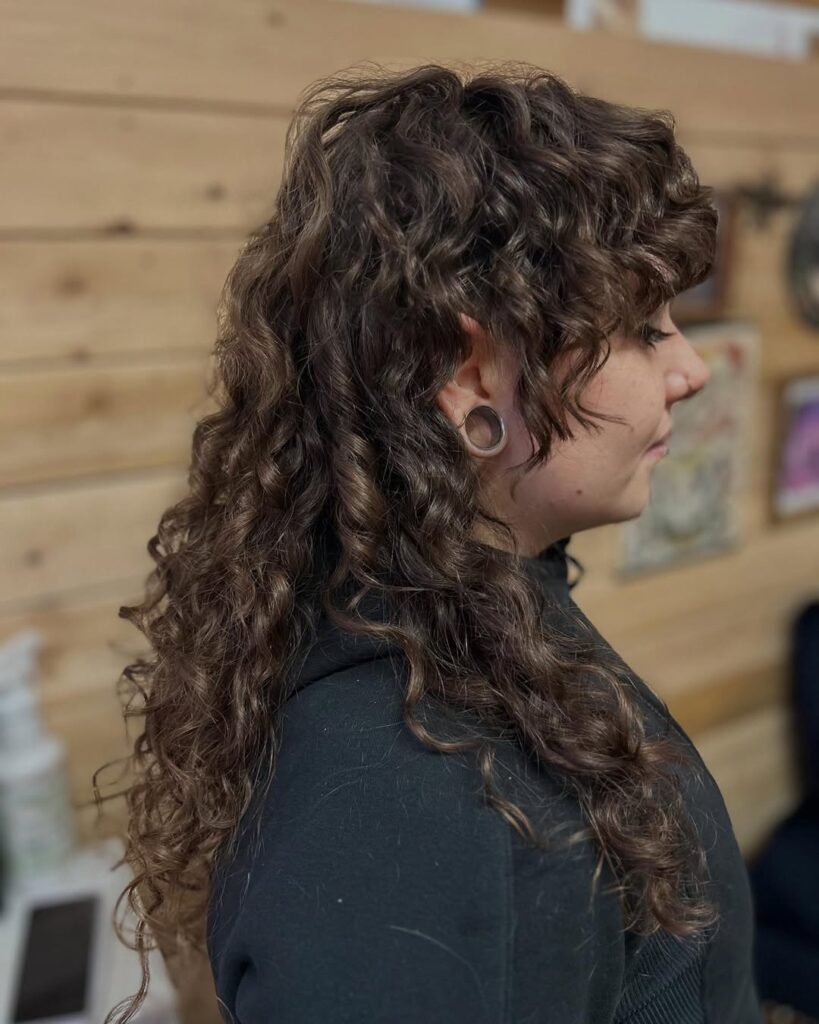 Unquestionably, the soft layering and the warmth of the hair color make this a highly versatile and approachable trendy curly mullet. Maintaining this kind of curl definition requires moisturizing products and careful air drying or diffusing to lock in the shape without creating frizz.