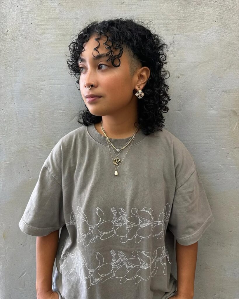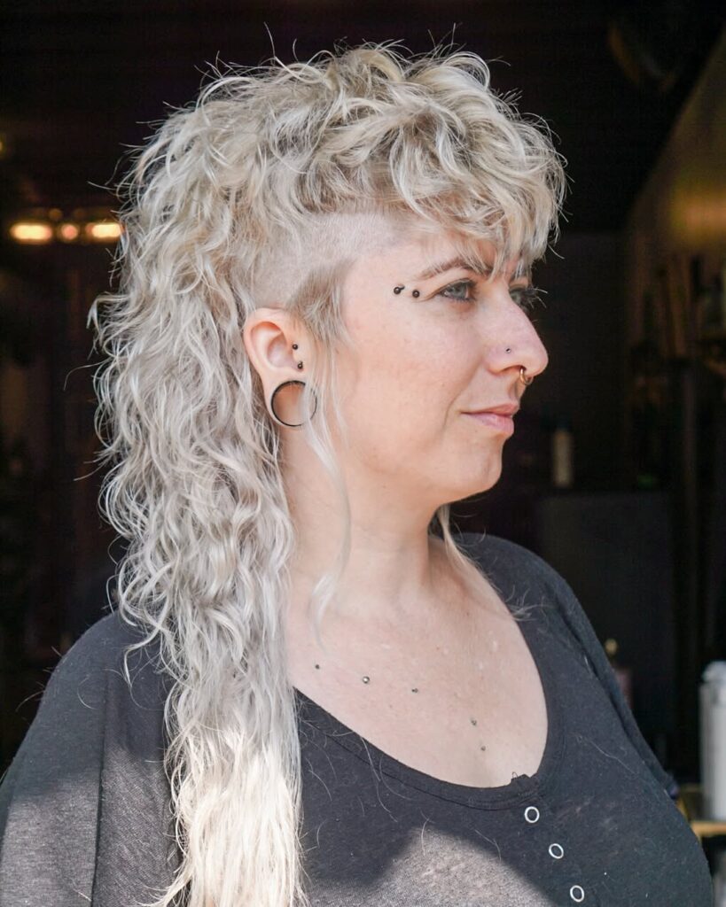 Admirably, this hairstyle is a prime example of a trendy curly mullet that incorporates hard lines for maximum impact and a rebellious feel. Maintaining the undercut requires regular trimming, which keeps the clean separation sharp and defined against the dark, bouncy curls.