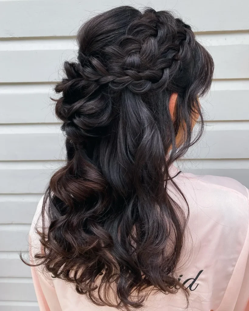 Voluminous curls cascading down the back offer a romantic contrast to the structured braiding. Use a large barrel curling iron to achieve these soft waves on the bottom sections. Spraying a light mist of flexible hold hairspray keeps the definition intact throughout a long workday.