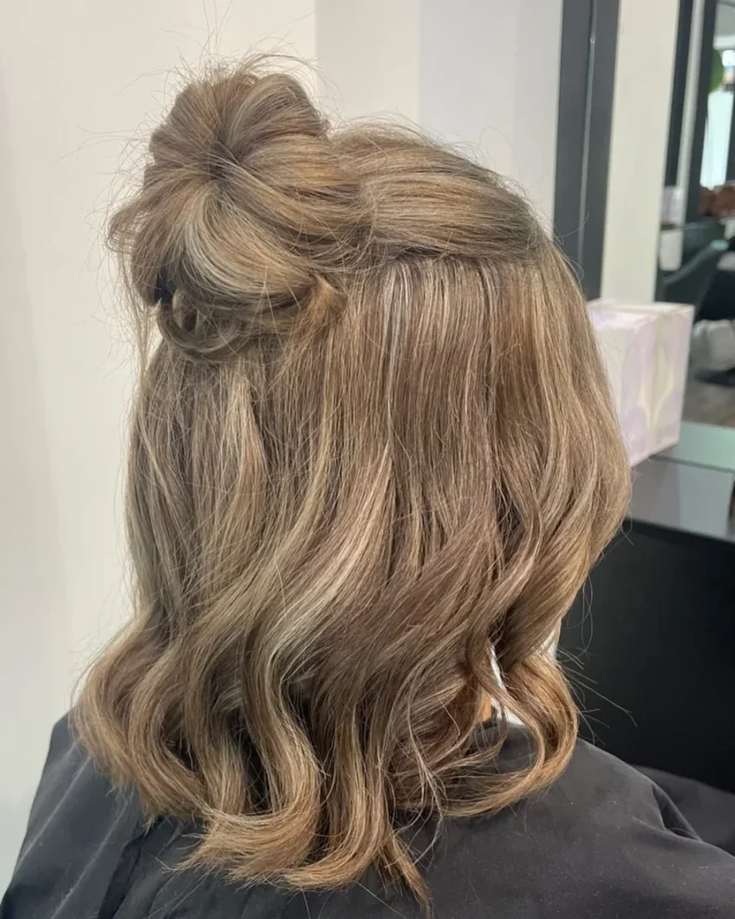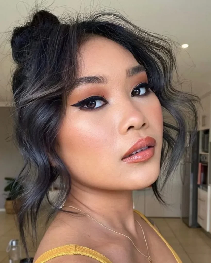 Texturizing spray serves as your best friend when attempting this voluminous look. High buns provide an instant face-lift effect while keeping strands away from your neck during hectic mornings. Gathering hair loosely at the crown ensures that you maintain that sought after organic movement seen in the image.