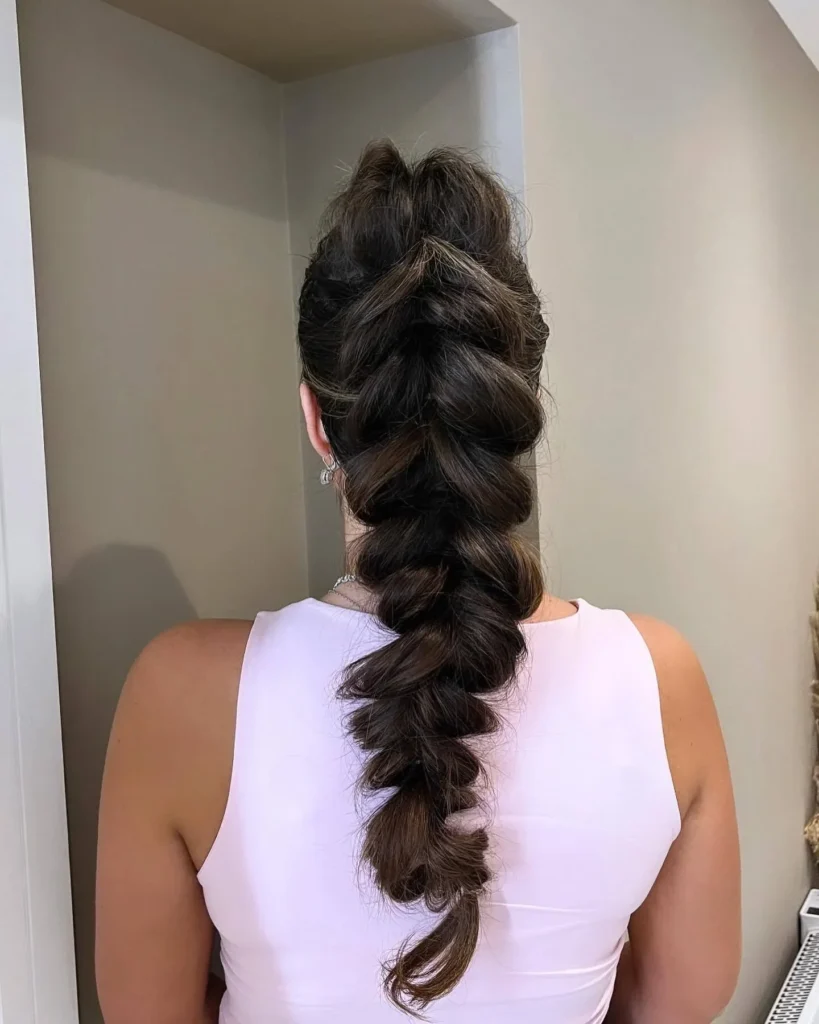 Transforming a basic plait into this thick, cascading look requires nothing more than a few clear elastics and gentle tugging. Strategic placement of the braid down the center of the back offers a balanced silhouette for professional or casual settings.