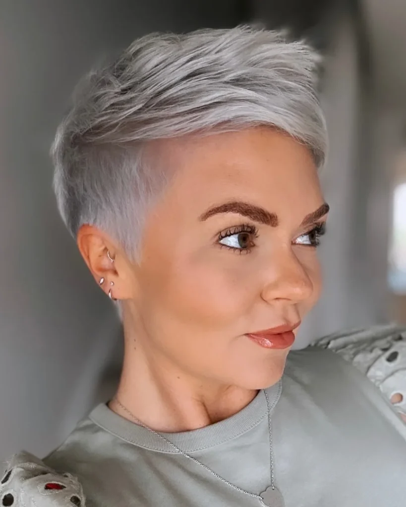 Silvery tones amplify the modern aesthetic of this cropped cut while hiding regrowth beautifully. Maintenance remains minimal because the short sides keep the silhouette clean as your hair grows. Busy mornings become much easier when your hairstyle relies on texture rather than heat styling or complex braiding.