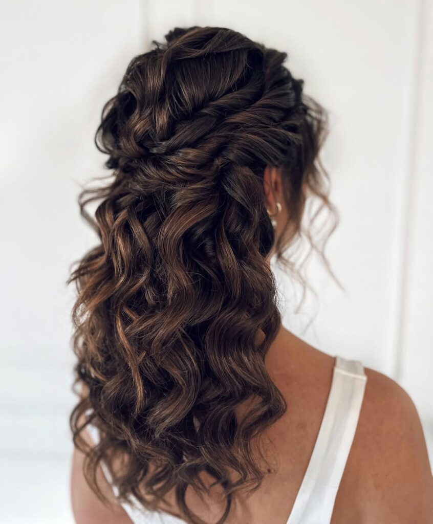 Cascading espresso waves intertwine to form a voluminous half-up style that celebrates depth and movement. Caramel highlights peek through the twists, catching ambient light to accentuate the intricate weaving at the crown. Loose ringlets tumble down the back in a coordinated yet relaxed pattern that feels high-fashion.