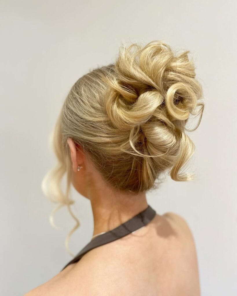 Sculpting hair into an effortless chic hairstyle requires a delicate balance of structure and movement. This particular look features a high, textured bun composed of soft, interlocking curls that create a voluminous and airy silhouette.