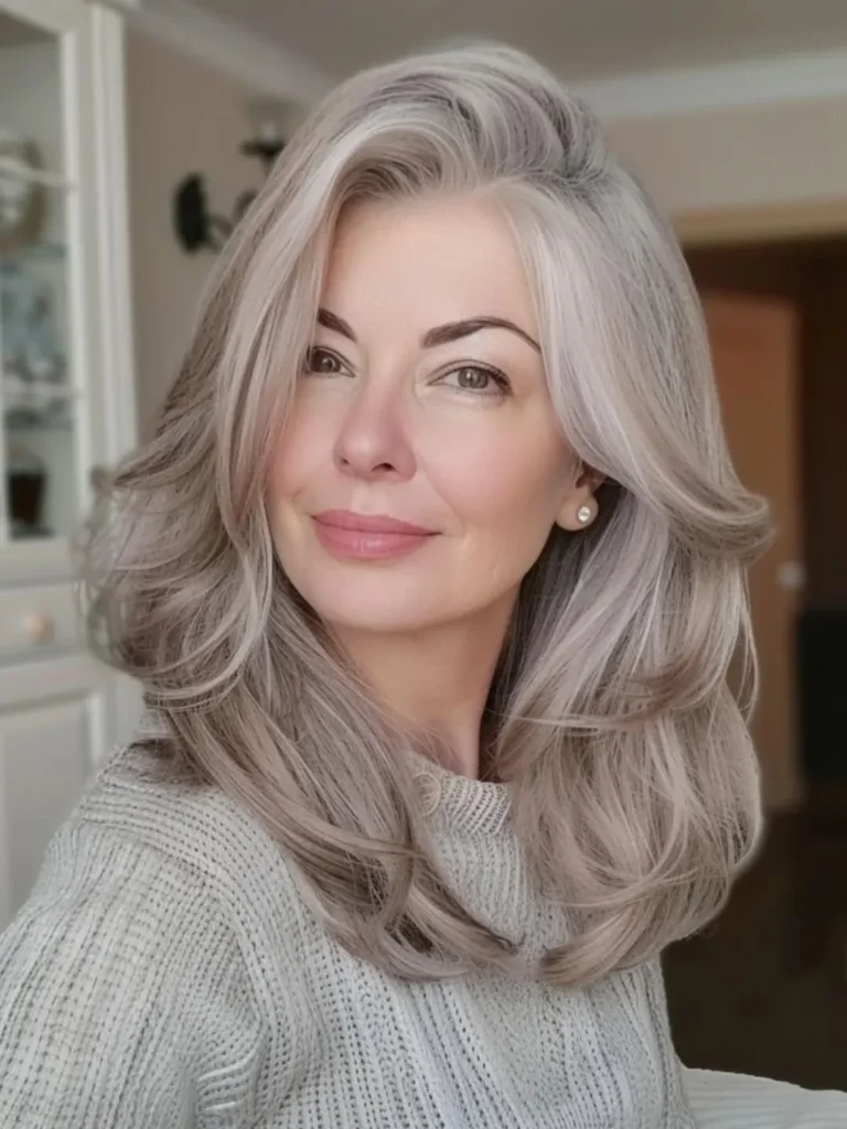 Luminous silver strands create a striking effortless chic hairstyle that celebrates natural maturity with modern flair. Deep side parting adds immediate height at the crown while allowing face-framing layers to sweep elegantly across the forehead.