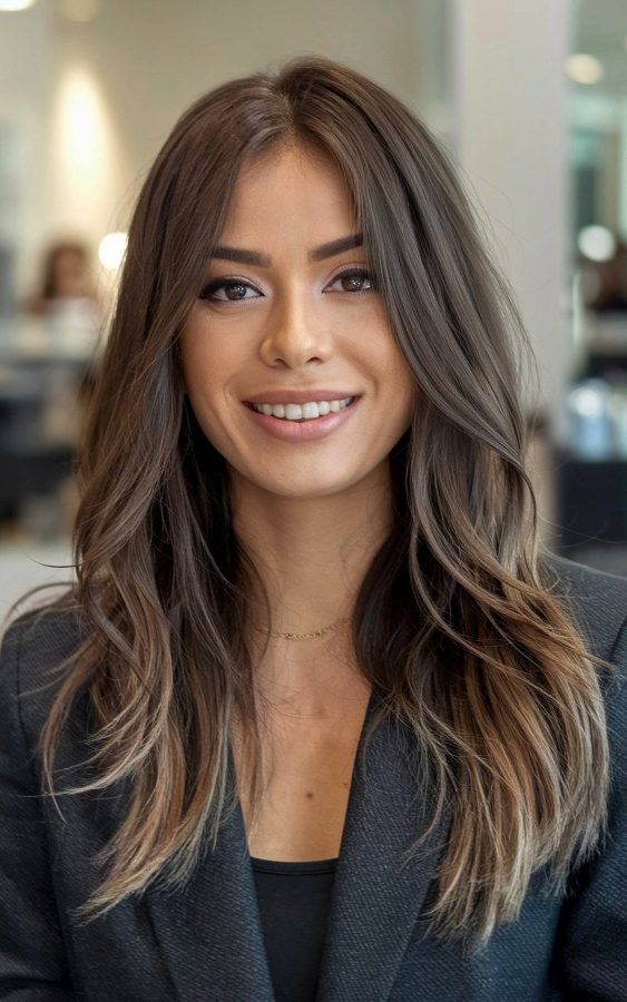 Pulchritudinous mocha tones define this modern professional look that frames the face with effortless grace. Soft, voluminous layers create a sense of movement that remains tidy enough for any corporate setting. This specific arrangement uses a center part to distribute weight evenly and keep long strands from obstructing your vision during critical tasks.