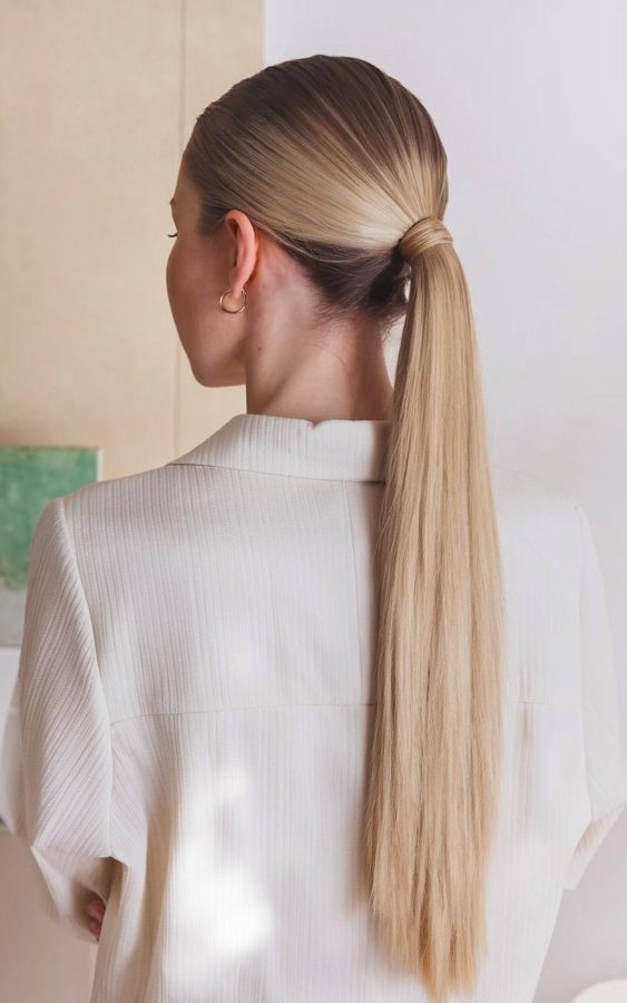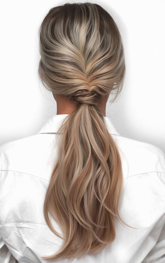 Elegant textures transform a basic ponytail into one of the most stunning work hairstyles ideas for girls seeking a refined image. This look utilizes a unique tucking technique that conceals the hair tie while adding architectural interest to the back of the head. Ash blonde tones mingle with darker roots to create a multidimensional effect that looks sharp against a crisp white professional blouse.