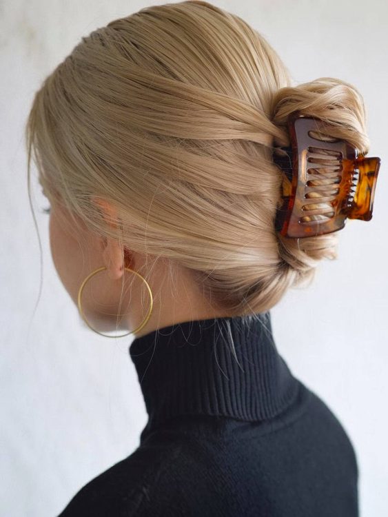 Glistening amber tones from the tortoise shell claw clip provide a rich contrast against lighter hair colors. Such accessories add a professional touch while maintaining a trendy aesthetic that transitions easily from the office to dinner. Choosing high-quality clips prevents breakage and keeps the style looking intentional rather than rushed or messy.