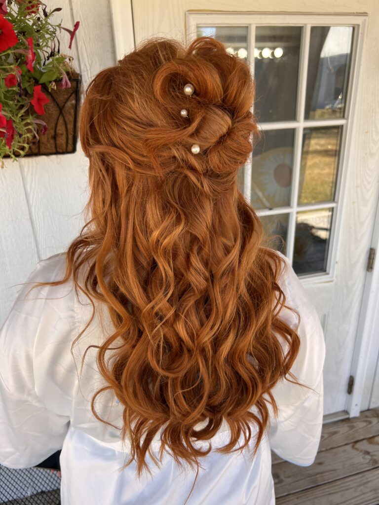 Cascading ringlets offer a relaxed yet polished feel that suits a winery or mountain setting. This arrangement allows the hair to flow naturally while keeping the top sections pinned back to showcase the face and jewelry. Texture remains key here as the stylist uses light waves to give the fine hair a sense of fullness and movement.
