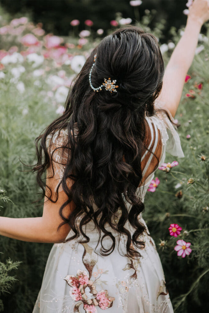 Bespoke accessories like this celestial piece offer a bold contrast that catches the light during outdoor golden hour ceremonies. This specific arrangement prioritizes natural movement while keeping the bulk of the hair away from the face for photography. Long, cascading ringlets flow down the back to mirror the organic floral embroidery found on the romantic bridal gown.