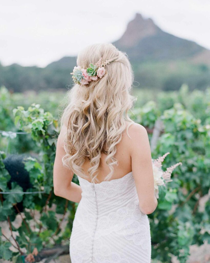 This specific entry for 21 half-up up half-down wedding hair ideas features a vibrant floral headpiece made of live succulents and soft pink roses. Greenery provides a refreshing pop of color that stands out beautifully against the pale blonde highlights of the bride.