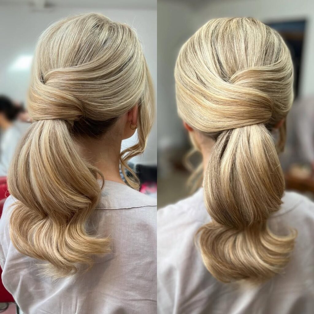 Exhibiting luxurious volume and a unique wrapped design, this hairstyle is a stunning, sophisticated option among gorgeous low ponytail hairstyle ideas. The beautiful blonde hair is styled with significant, rounded lift at the crown, flowing into an intricately twisted or rolled section that seamlessly forms the base of the ponytail.