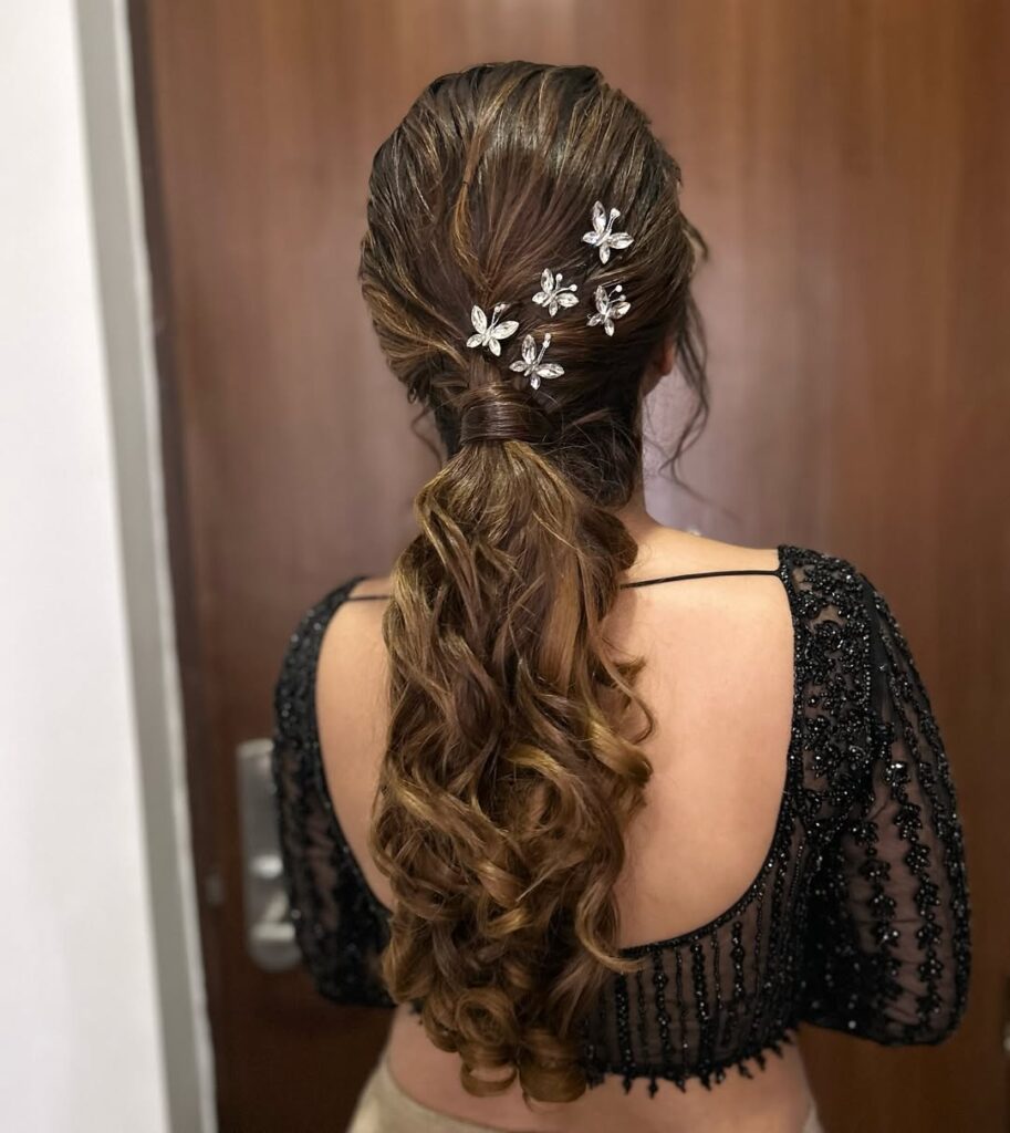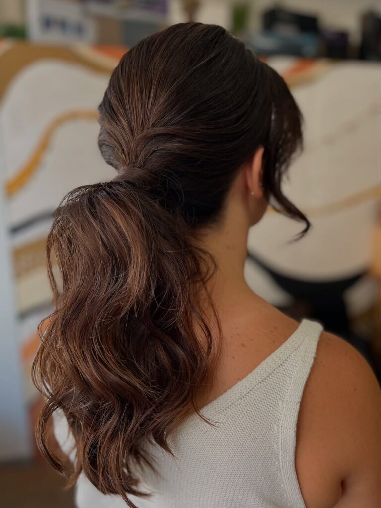 Undoubtedly, the length of the ponytail flows in soft, defined waves, showcasing the beautiful depth and highlights in the dark brunette hair. A deliberate messy wave adds appealing movement, ensuring the style avoids looking overly stiff or severe.