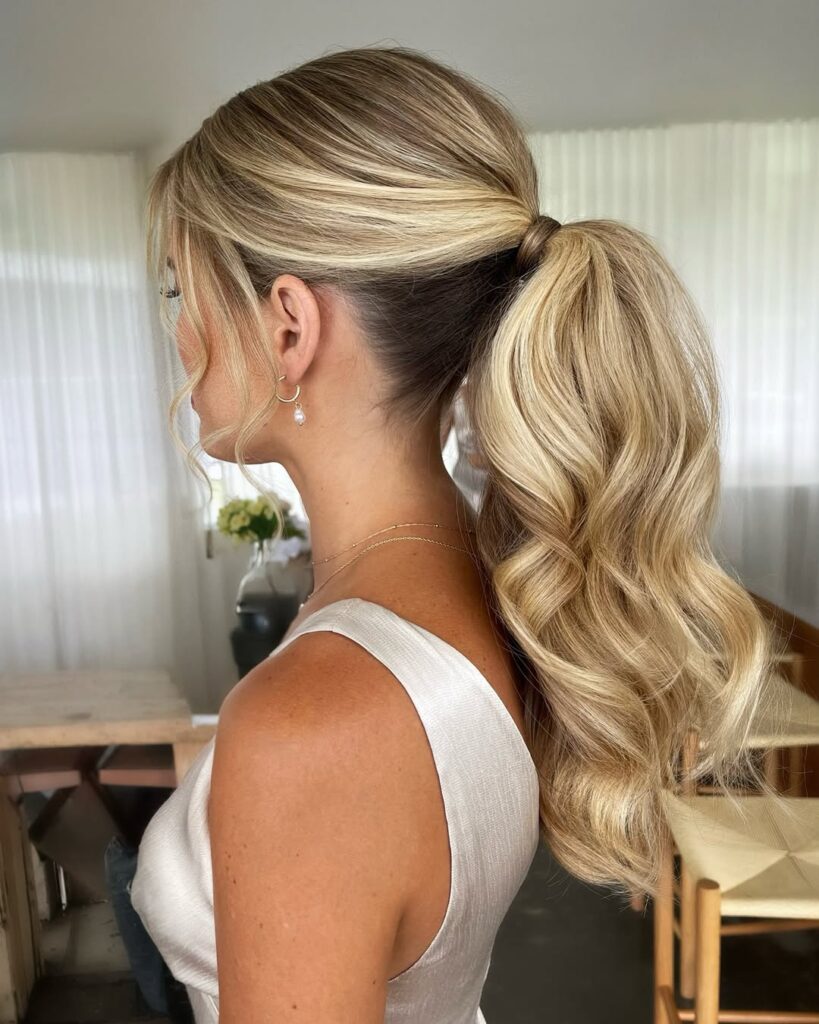 Exhibiting a soft, approachable glamour, this hairstyle is a beautiful example of gorgeous low ponytail hairstyle ideas, defined by its lovely face-framing curls. The gorgeous blonde hair is smoothly gathered low at the nape of the neck, maintaining a soft, subtle lift at the crown that prevents the style from looking flat.