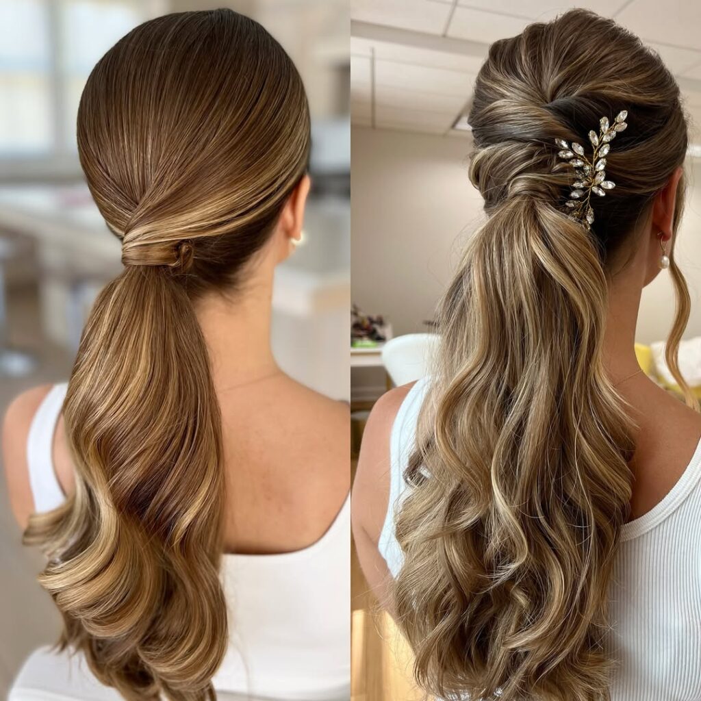 6. Ultra-Sleek Hollywood Wave Low Ponytail