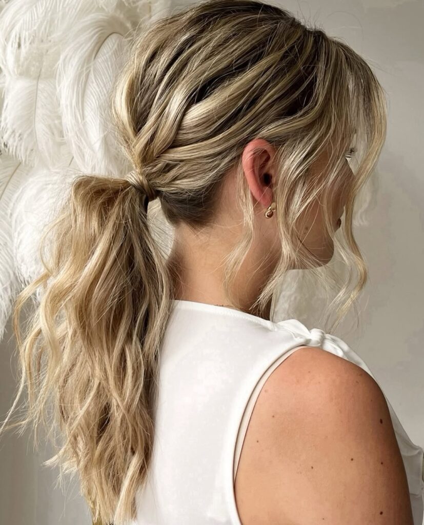 Charmingly relaxed, this hairstyle exemplifies one of the most casually gorgeous low ponytail hairstyle ideas, defined by its light, airy texture. The gorgeous blonde hair features subtle highlights and lowlights, creating a naturally dimensional, sun-kissed effect that catches the light beautifully.