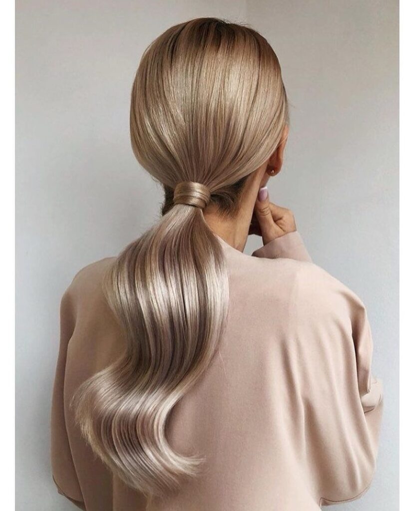 Exhibiting luxurious smoothness and an intricate tie detail, this stunning hairstyle is a gorgeous low ponytail hairstyle idea, perfect for high-end events. The beautiful blonde hair, rich with platinum highlights, is pulled back flawlessly, creating a seamless, voluminous contour across the crown and sides.