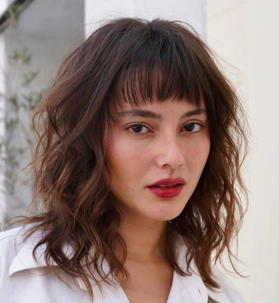 Luminous chocolate brown waves define this spirited look, showcasing how movement can elevate medium-length hair. Straight-cut micro bangs sit boldly across the forehead to provide a sharp contrast against the wild, tousled texture of the sides. This specific combination creates a youthful and artistic vibe that feels modern yet comfortably lived-in.