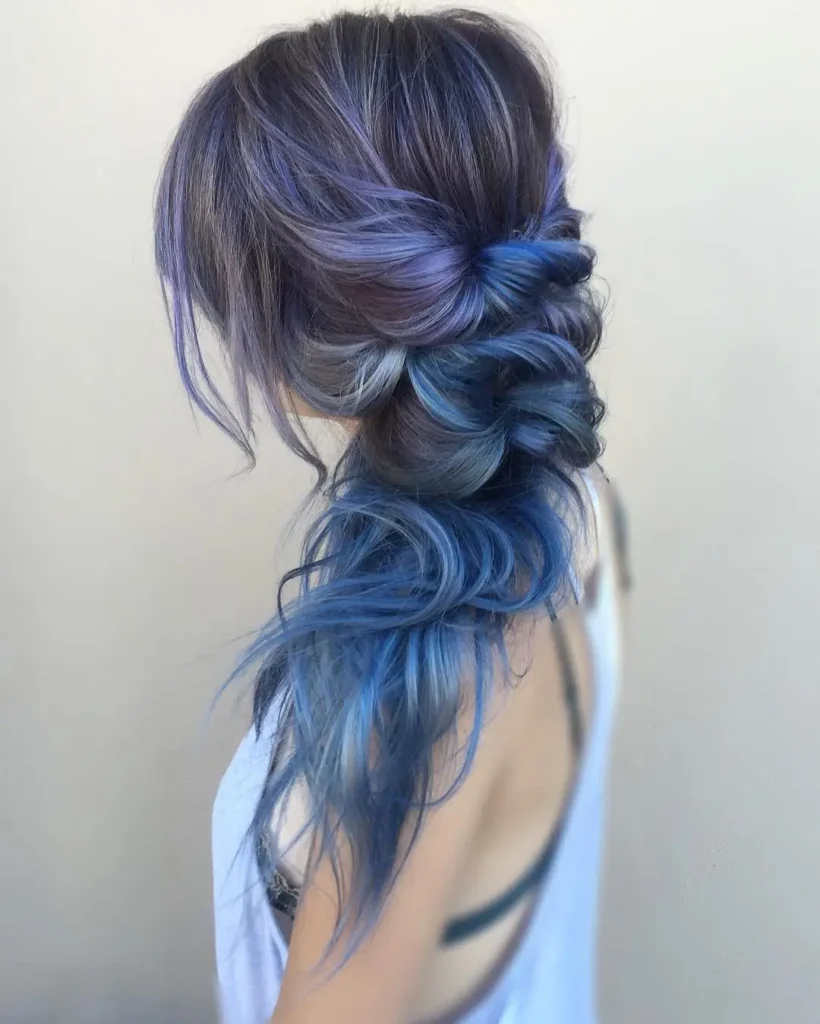 Cerulean and lavender hues blend seamlessly through this intricate side braid, creating a magical oceanic effect. Deep violet roots transition into vibrant teal waves that cascade over one shoulder with a purposefully deconstructed finish.