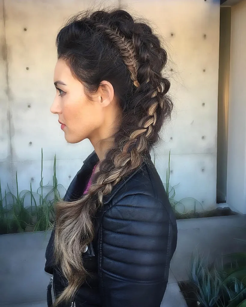Exquisite volume is built into the crown to create a powerful, mohawk inspired shape that commands attention. You can achieve this structured yet lived in look by combining a traditional Dutch braid with a smaller fishtail accent. Wispy strands are left to fly free around the hairline to soften the transition from the scalp to the braided bulk.