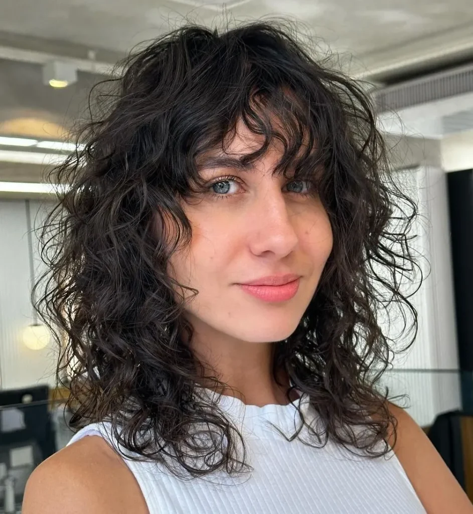 Luminous obsidian curls cascade around the face to showcase a bold and artistic silhouette. Wispy bangs sit lightly on the forehead to add a soft touch to the otherwise wild and energetic texture. This specific look relies on intense hydration to keep each ringlet defined while maintaining the volume required for messy hairstyles for every hair length.